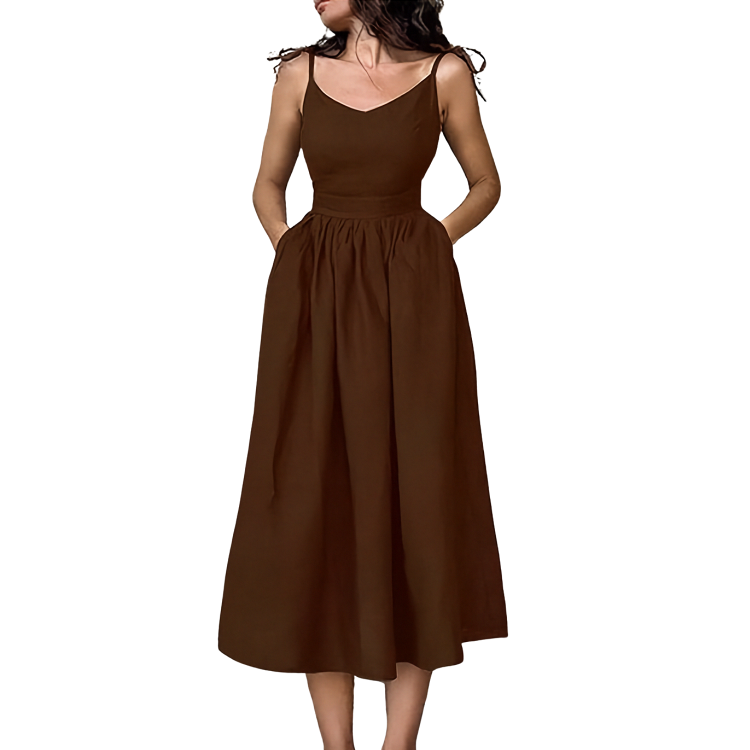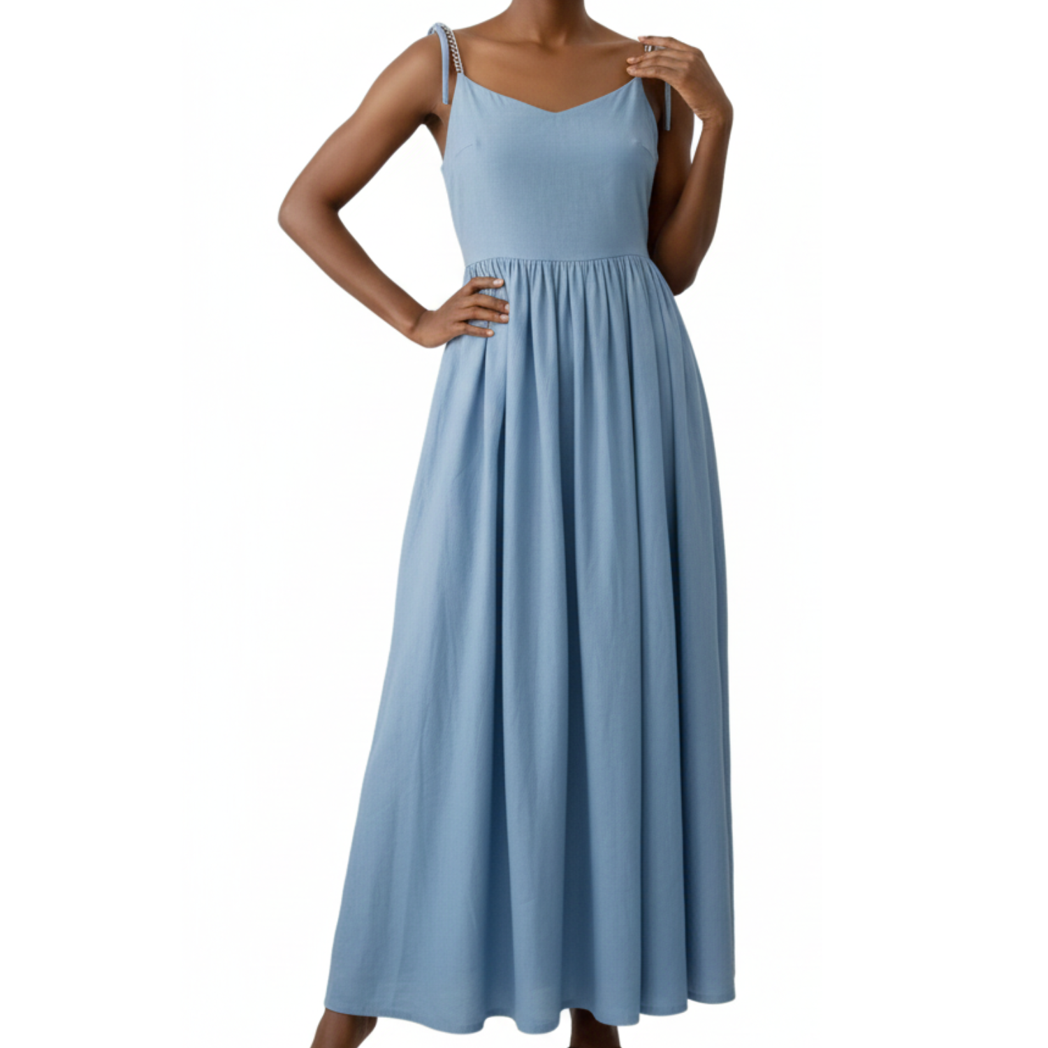 This elegant midi dress brings a fresh, feminine touch to warm-season styling, making it ideal for daytime outings, summer gatherings, and relaxed evening moments. The V-neckline, open back detail, and flowing silhouette create a balanced look that feels light, graceful, and effortlessly refined.